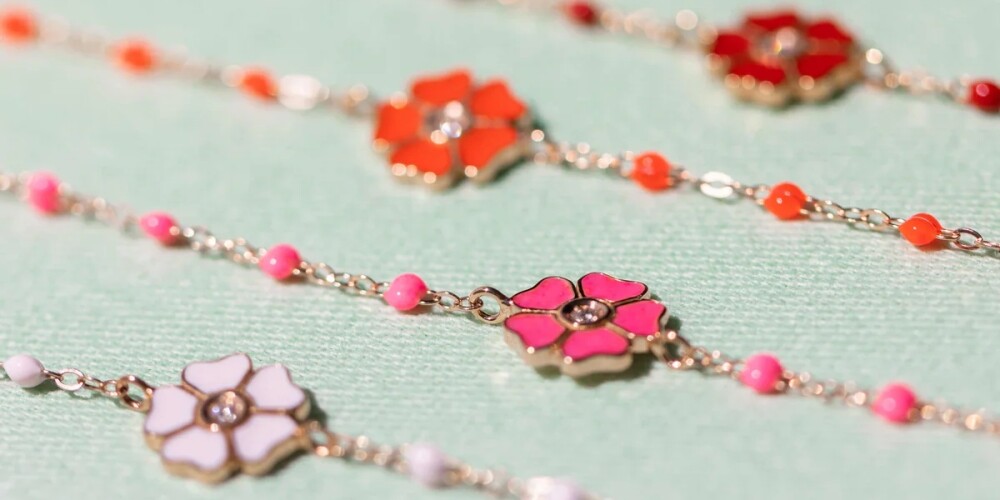 Sa chaîne fine en or rose 18 carats s’associe à de délicates perles de résine colorées, sublimées par une fleur précieuse sertie d’un diamant.