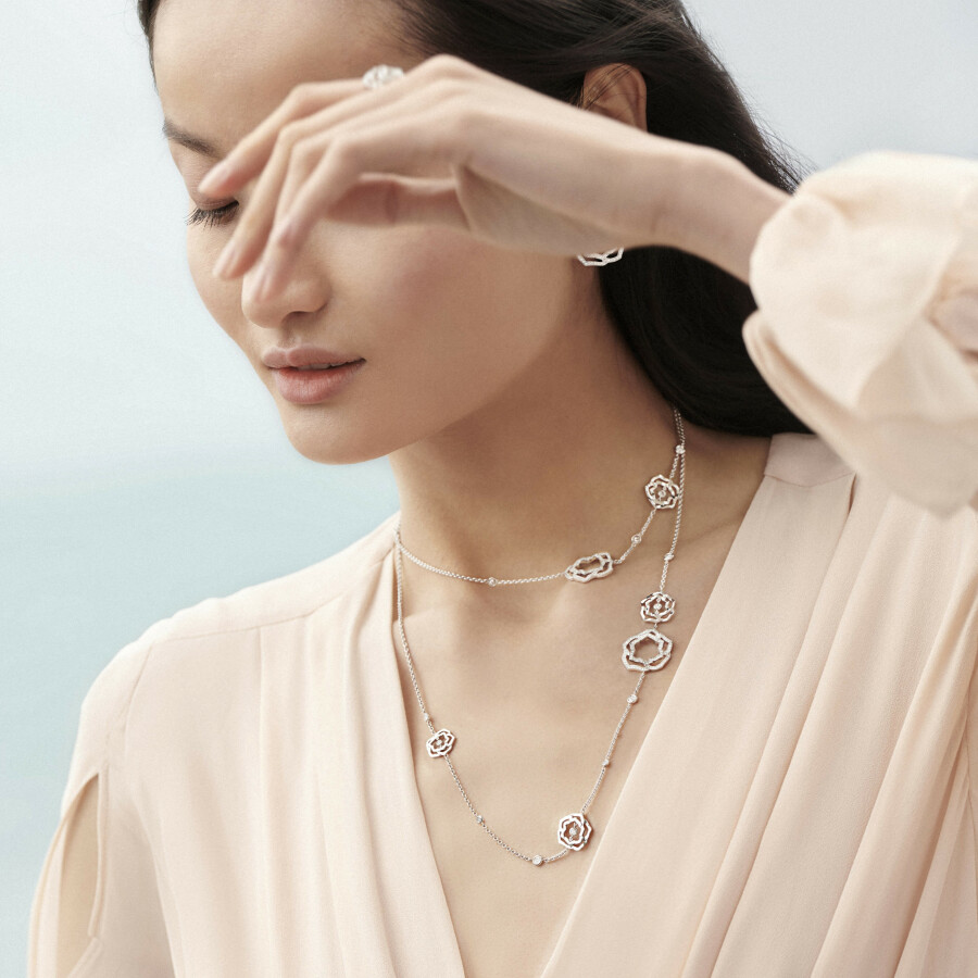 La Rose Piaget se rapporte au nom de la fleur Lauréate baptisée d’après Yves Piaget. La couleur de cette rose peut aller du rose pâle au fushia vibrant et est reconnue pour l’exubérance de ses 80 couches de pétales ainsi que pour la fragrance envoûtante aux arômes fruités qu’elle exalte. Piaget continue de célébrer son amour des roses avec la collection de joaillerie Piaget Rose, capturant ainsi l’essence de ces fleurs avec des métaux précieux, des diamants et des pierres de couleur, en redessinant ses pétales dans l’air du temps. Elle comprend deux sets (or rose et or blanc) qui incluent des bagues serties de diamants, des boucles d’oreilles et des colliers reprenant une nouvelle version plus moderne de cette fleur délicate.