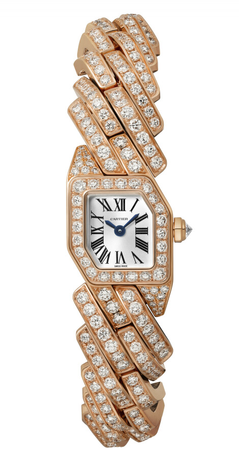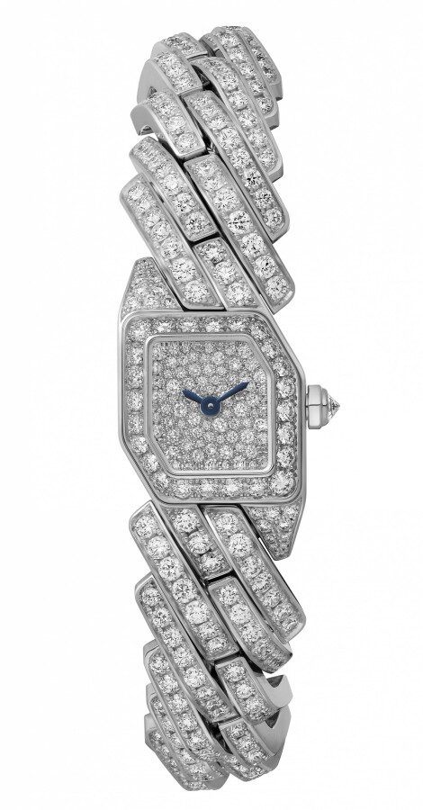 Pièce libre pour femmes qui ne le sont pas moins, elle affiche un « twist » inédit dans son bracelet et qui se prolonge sur sa boîte. Fusion des éléments et des formes, elle incarne plus qu’aucune autre la montre-bracelet. À moins que ce soit un bracelet-montre ? Probablement un peu des deux, dans un exercice stylistique qui transcende les codes. Tout réside dans le twist des lignes, cette torsion donnée à la perspective dans laquelle s’intègre le cadran de la montre. Fusionnels, le boîtier et les maillons s’enlacent dans un même élan graphique. Avec ces maillons rectangulaires, son cadran hexagonal et ses brancards en biseau, le design de la montre Maillon de Cartier fait entrer la géométrie de Cartier dans une tension inédite. La Manufacture affiche sa volonté d’architecturer l’ensemble, de la forme des maillons à celle du boîtier à pans coupés qui radicalisent l’esprit de la montre. Le volume est palpable, anguleux et dense. Faisant la part belle à l’or (gris, rose, jaune), la collection Maillon se décline en un unique format serti ou non serti, en collection comme en série limitée de Haute Joaillerie mariant diamants ou tsavorites. Pièce d’élégance quotidienne ou de bal, la Maillon incarne la quintessence du style Cartier.