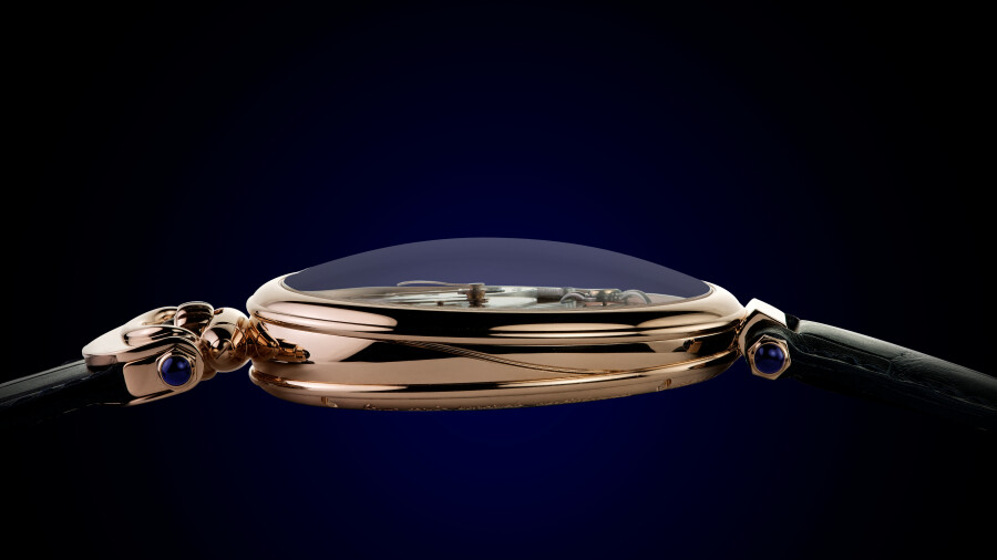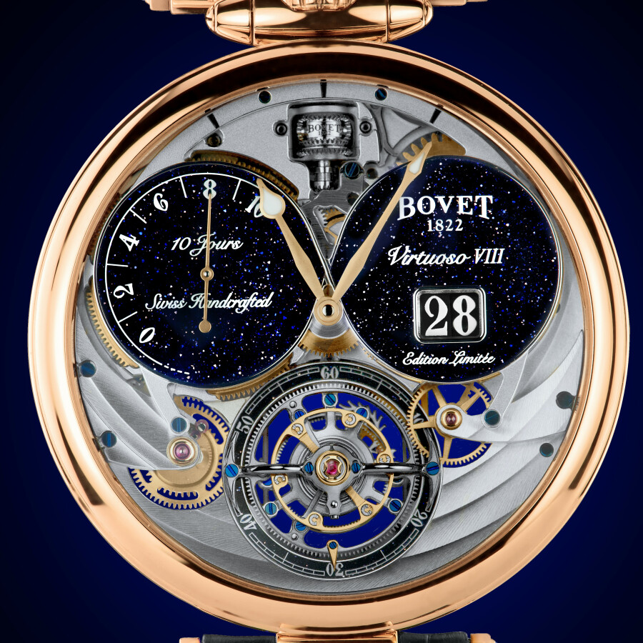 Si le tourbillon Virtuoso VIII est l’ultime expression de la tradition de l’horlogerie artisanale telle que conçue chez Bovet depuis 1822, son mouvement comporte d’importantes innovations, à l’instar de ses trois brevets. Proposée en verre aventuriné bleu, la forme du cadran est en 8 disposé horizontalement et assoit la symétrie du garde-temps en soulignant les deux complications qu’il affiche : son indicateur de réserve de marche et sa grande date. Une pièce rare éditée à seulement 50 exemplaires.