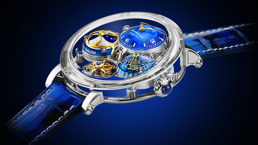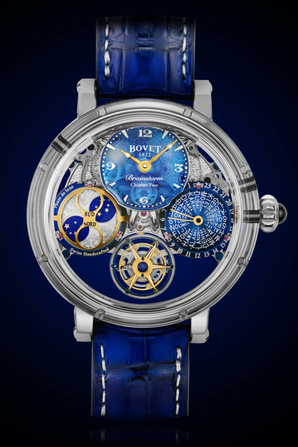 La Brainstorm Récital 26 Chapter Two a occupé le bureau technique et les horlogers de la Maison durant quatre ans. Les informations s’affichent avec cohérence dans le volume du boîtier. Un cadrandôme affiche les heures et les minutes de l’heure locale, dans la partie supérieure du boîtier. Les secondes se lisent par un index fixé sur le tourbillon à 6h et qui effectue une révolution en 60 secondes.