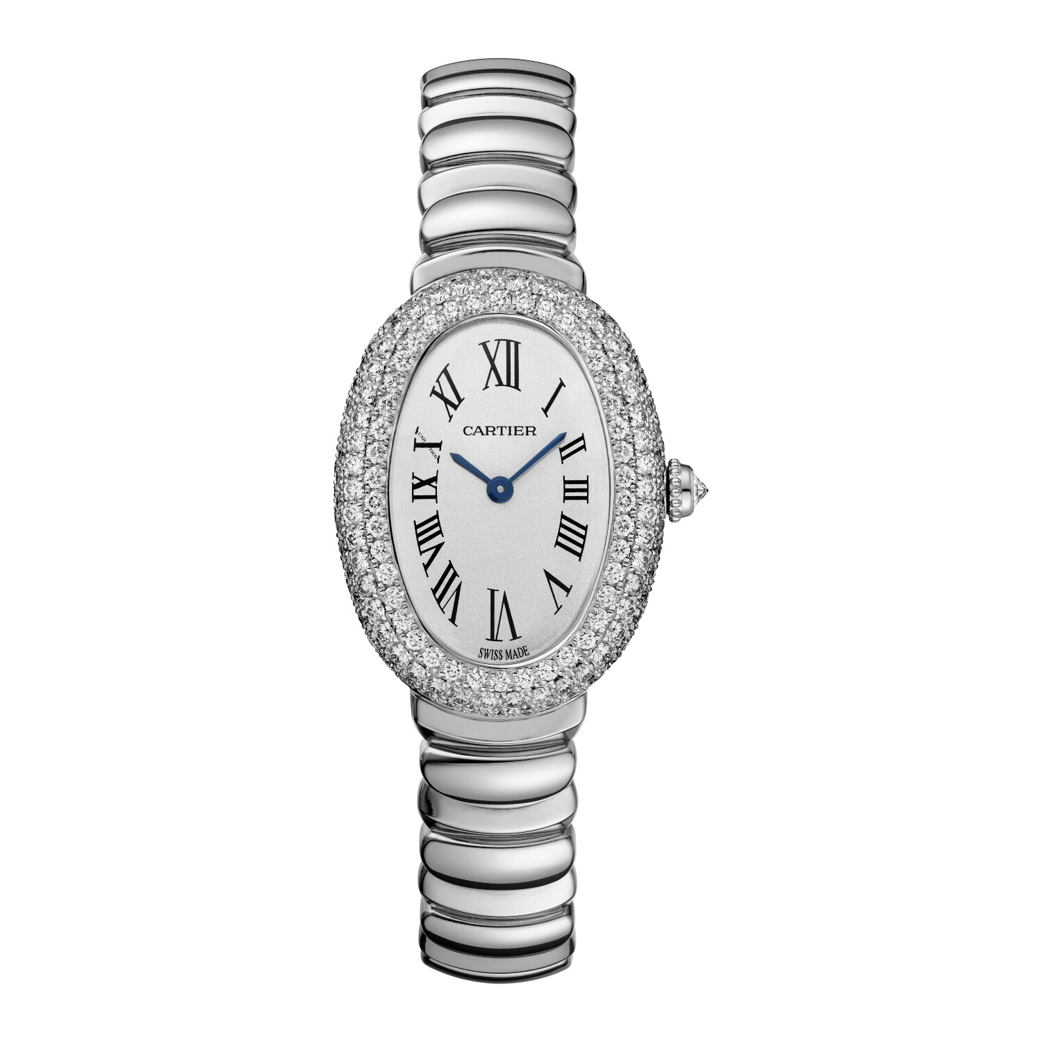 Baignoire Baignoire de Cartier watch, small model, quartz movement. 18K white gold (750/1000) case set with 227 brilliant-cut diamonds totaling 2.3 carats. 18K white gold (750/1000) beaded crown set with a diamond cabochon totaling 0.08 carats. Silvered dial, blued-steel sword-shaped hands, sapphire crystal. Rhodium-finish 18K white gold (750/1000) bracelet. Length: 31.4 mm, width: 23.1 mm, thickness: 7.6 mm. Water-resistant up to 3 bar (approx. 30 meters/100 feet).