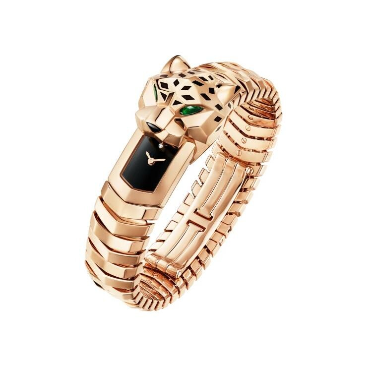 Panthère de Cartier watch, quartz movement. 18K rose gold (750/1000) panther head and case, pear-cut tsavorite eyes, buff-top onyx nose, black lacquer spots, black lacquer dial, rose-colored steel sword-shaped hands, sapphire crystal, 18K rose gold (750/1000) bracelet.
