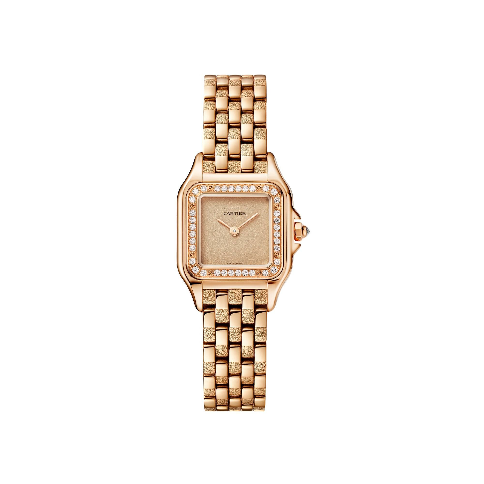 Panthère de Cartier watch, small model, quartz movement. 18K rose gold (750/1000) case set with 37 brilliant-cut diamonds totaling 0.26 carats. Dimensions: 22 mm x 30 mm, thickness: 6 mm. 18K rose gold (750/1000) octagonal crown set with a brilliant-cut diamond totaling 0.02 carats. Rose gold-colored grained dial with sparkling effect, rose gold-colored-finish sword-shaped hands, textured 18K rose gold (750/1000) bracelet. Water-resistant up to 3 bar (approx. 30 meters/100 feet).