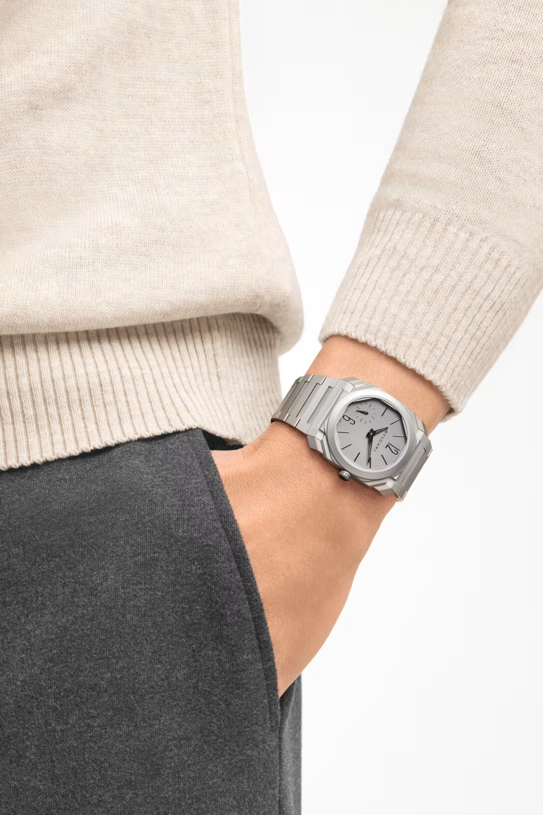 Le boîtier de 37 mm, 6,45 mm d'épaisseur seulement, conserve la géométrie octogonale caractéristique de la collection — cet héritage d'inspiration romaine qui rend l'Octo Finissimo immédiatement identifiable parmi toutes les montres de sport-chic contemporaines. Légère, équilibrée, naturellement adaptée à un large éventail de situations, cette nouvelle proportion s'impose avec l'évidence des meilleures décisions de design.