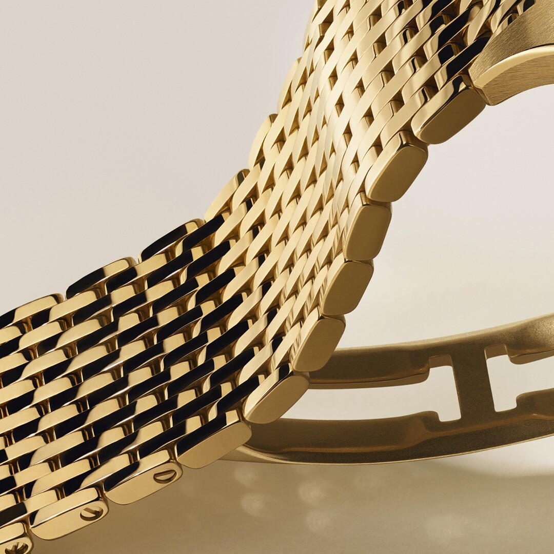 La grande nouveauté est son bracelet : 394 maillons de 1,15 mm d'épaisseur, organisés en 15 rangs, usinés, finis et assemblés à la manufacture de La Chaux-de-Fonds. La souplesse obtenue est extraordinaire — textile presque plus que métallique, une sensation de drapage au poignet qui rappelle les bracelets Cartier des années 1920 dont il s'inspire directement.
