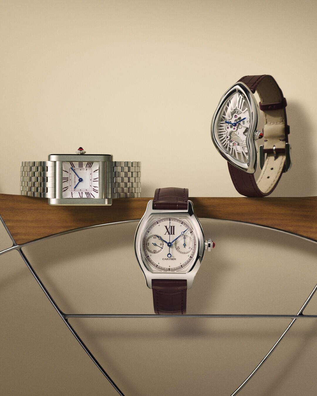 Le premier, réunit la Tank Normale, la Tortue Chronographe Monopoussoir et la Crash Squelette dans un vocabulaire commun : platine 950, accents bordeaux, aiguilles en acier bleui. La Tank Normale retrouve son légendaire bracelet platine sept rangs, avec des aiguilles à fort contraste . La Tortue Chronographe Monopoussoir embarque le calibre manufacture 1928 MC, chronographe monopoussoir de seulement 4,30 mm d'épaisseur — le plus fin de la Maison — dans un cadran rendant hommage à la référence 2396 de 1998, avec son immense "XII" solitaire et ses index appliqués en forme de points.