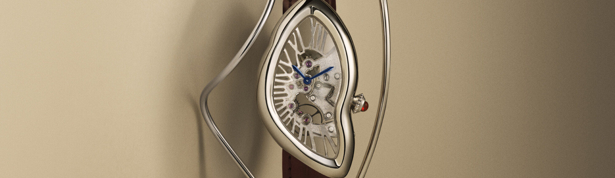 Mais la pièce qui concentre toutes les attentions est sans conteste la Crash Squelette, dotée d'un tout nouveau calibre manufacture 1967 MC spécialement développé pour épouse les lignes distordues de ce boîtier impossible. Les ponts sont intégralement martelés à la main selon une technique de tremblage nécessitant près de deux heures de travail par pièce, et leur architecture intègre les chiffres romains dans la structure même du mouvement — une construction brevetée qui fait de chaque exemplaire une sculpture en miniature. Limitée à 150 pièces numérotées, cette Crash Squelette sera inévitablement l'une des pièces les plus convoitées de l'année horlogère.