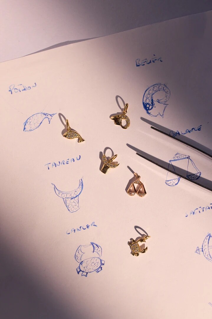 L'autre grande nouveauté de cette saison SS26, c'est la collection Zodiaque — et elle répond à une envie bien contemporaine : celle de la personnalisation significative. Douze pendentifs en or rose représentent chacun un signe astrologique, sculptés avec le soin caractéristique de la maison. Des accessoires précieus, immédiatement identifiables, qui s'associent naturellement aux chaînes Gigi Clozeau pour composer des parures uniques.