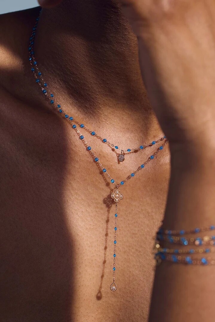C'est sans doute l'une des couleurs les plus évocatrices qui soit pour une collection estivale : un bleu azur profond et lumineux, posé avec précision sur les chaînes d'or signature de la maison. La collection Azur décline cette teinte en colliers superposables, bracelets et accessoires portés à même la peau, avec cette fluidité propre à Gigi Clozeau.