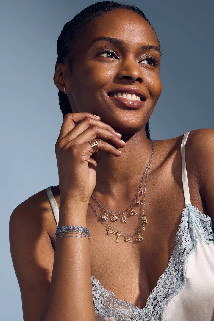 C'est là toute l'intelligence de la marque : proposer des pièces indépendantes qui, une fois réunies, forment un ensemble d'une cohérence évidente. La résine bleue apporte la couleur et la vivacité ; l'or et les pendentifs zodiacaux apportent la profondeur et la signification. Ensemble, ils composent une garde-robe joaillière pour la belle saison, à la fois légère et précieuse.