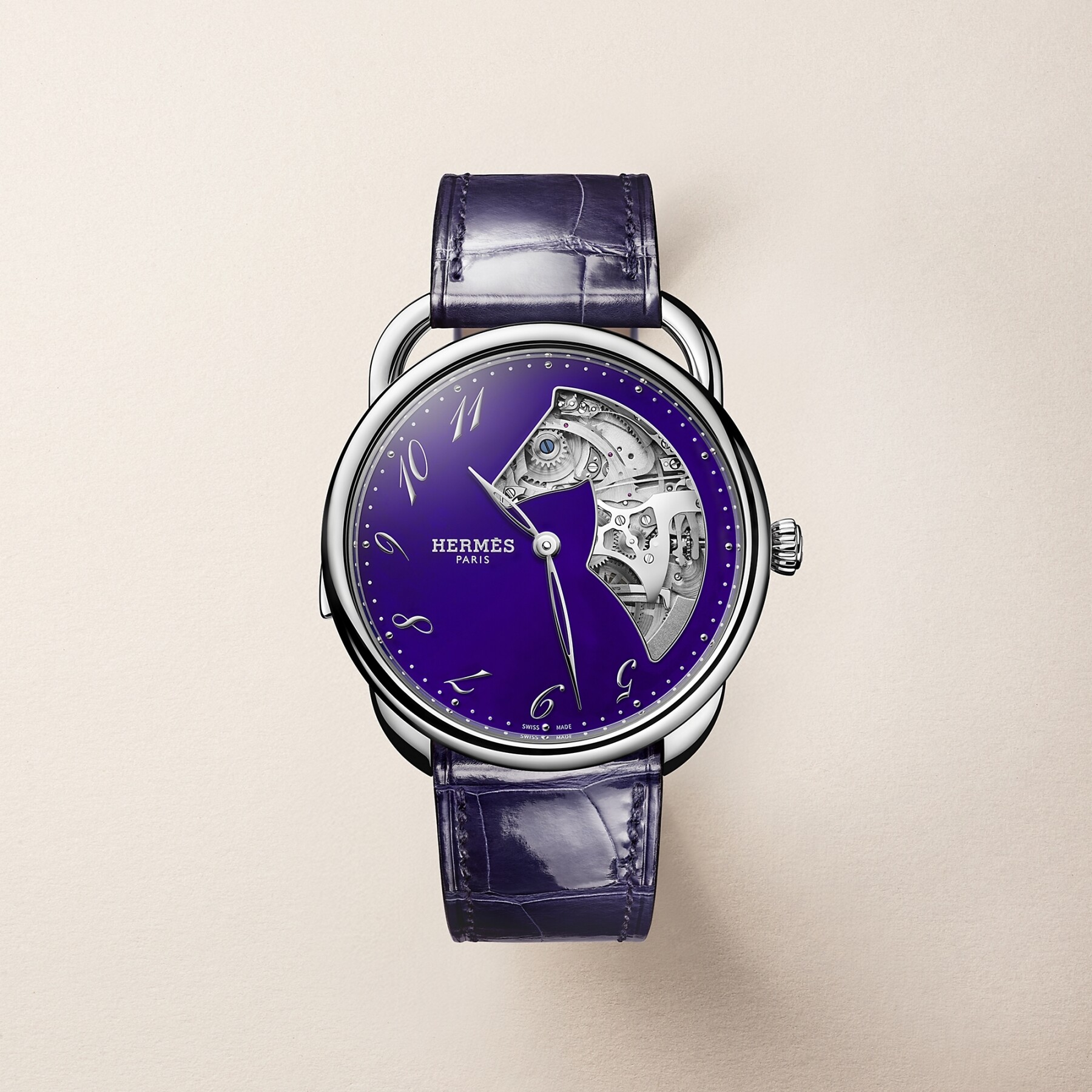La ligne Arceau, créée en 1978 par Henri d'Origny, n'a jamais été aussi pleinement elle-même que dans cette version. Son boîtier de 38 mm aux attaches asymétriques — directement inspirées des étriers équestres — accueille un cadran en cristal Saint-Louis ajouré d'une tête de cheval, découpe qui révèle le nouveau mouvement mécanique squeletté à remontage automatique H1927. Un calibre dessiné et fabriqué exclusivement pour Hermès, sur mesure dans le sens le plus littéral du terme.