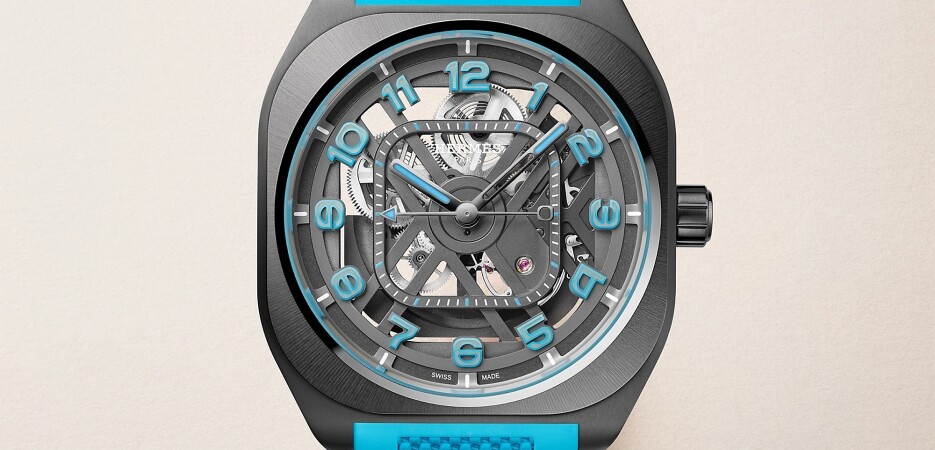 La H08 Squelette se décline en deux versions, chacune associée à un bracelet en caoutchouc structuré à effet "tissé" — une signature tactile immédiatement reconnaissable. Sur la version bleue, les index en Super-LumiNova® renforcent le jeu chromatique et soulignent avec intensité le caractère graphique de l'ensemble. Une montre qui affirme sa modernité sans jamais hausser le ton. Prix : 20 000 €.