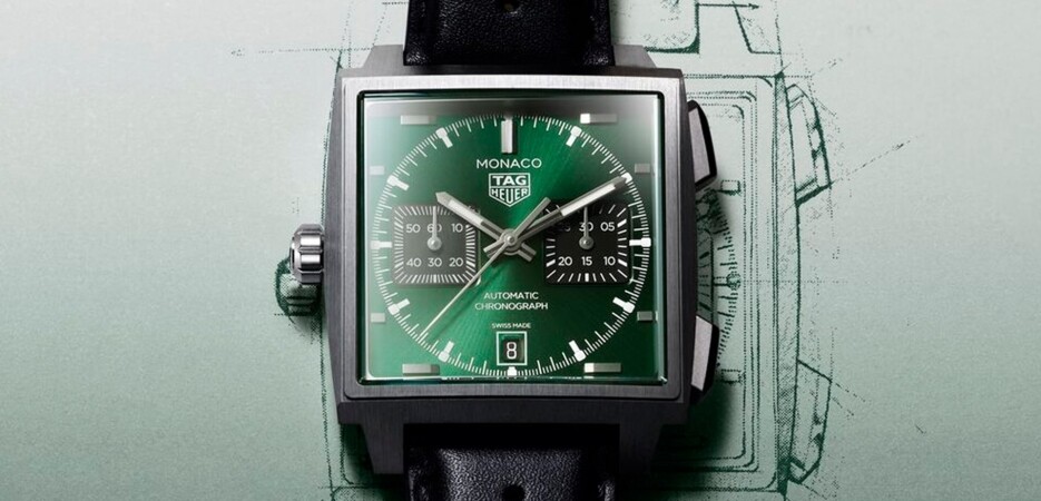 Présentée en trois déclinaisons soigneusement choisies, la collection reprend les codes chromatiques les plus forts de la Monaco : le bleu opalin à accents rouges qui évoque directement la référence McQueen, le vert soleillé brossé dans l'esprit du British Racing Green, et un modèle noir élégant en boîtier bicolore titane et or rose 18K 5N. Chacune est accompagnée d'un bracelet d'inspiration racing en cuir de veau perforé.