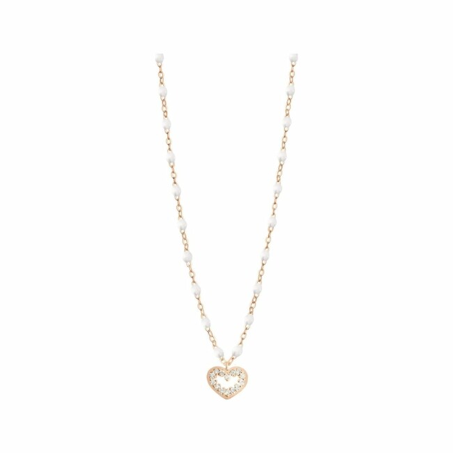 Sa chaîne délicate en or rose 18 carats s’harmonise avec de fines perles de résine colorées, rehaussées d’un cœur précieux serti de diamants.