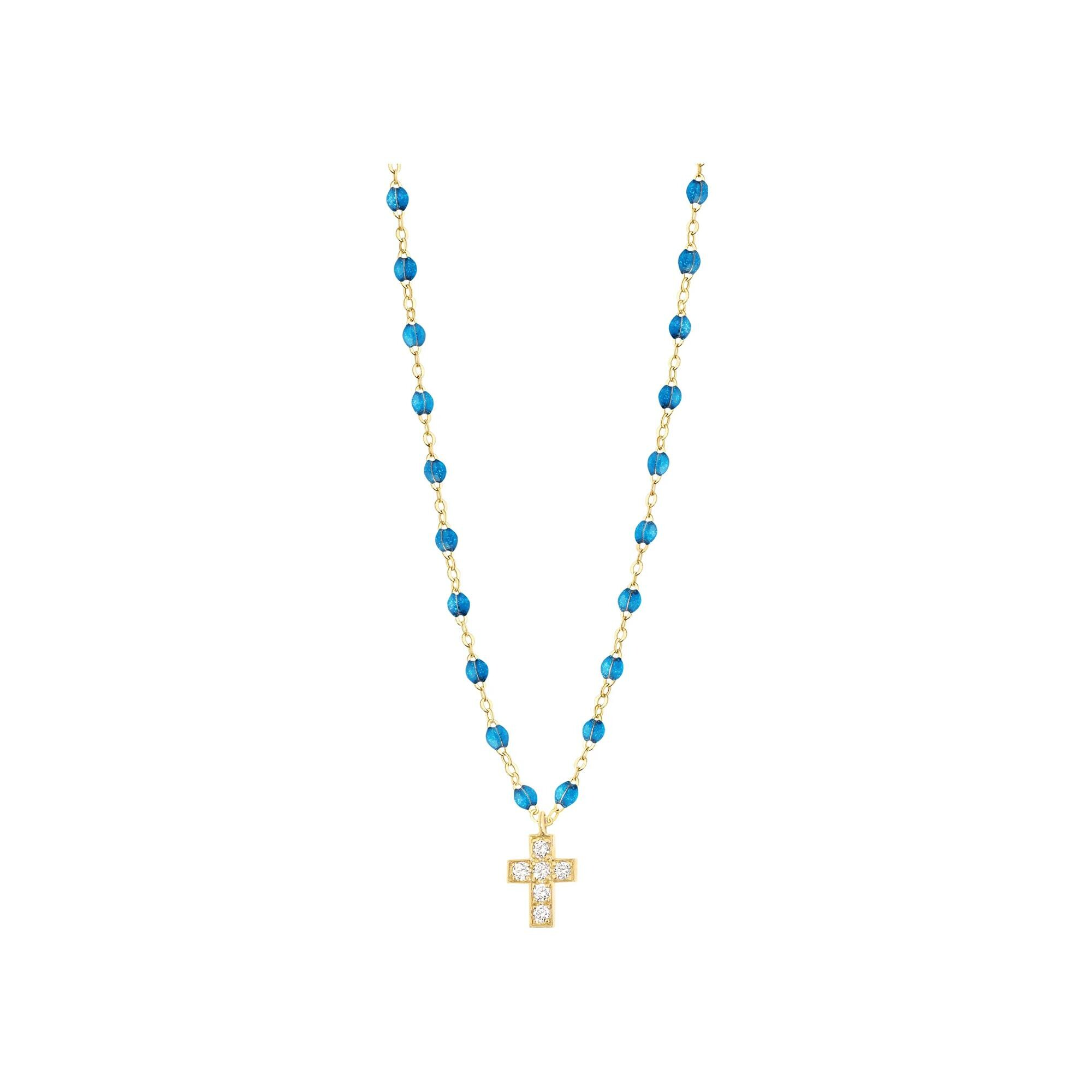 Collier Gigi Clozeau Croix en or jaune, résine azur et diamants, taille 42cm