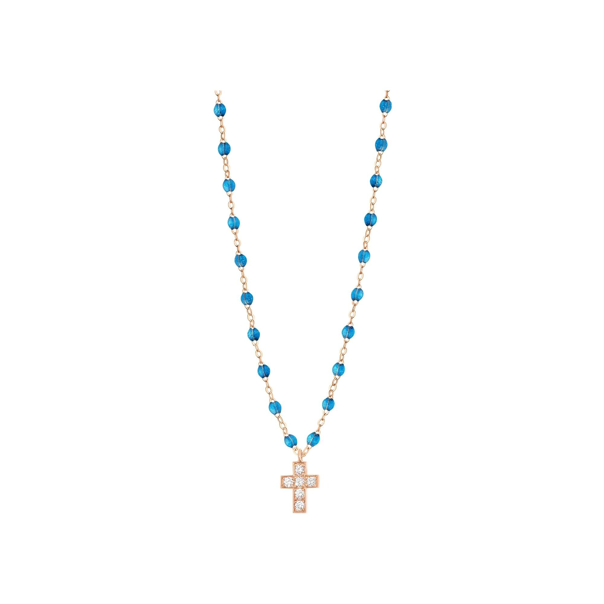 Collier Gigi Clozeau Croix en or rose, résine azur et diamants, taille 42cm