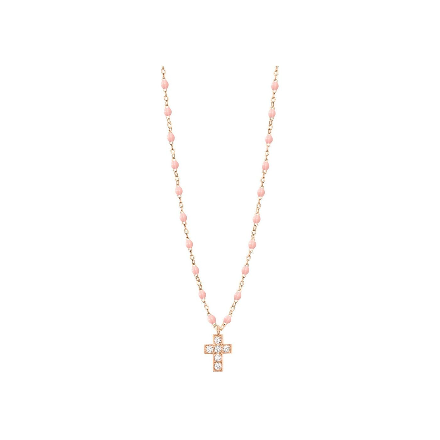 Collier Gigi Clozeau Croix en or rose, résine rose bébé et diamants, taille 42cm