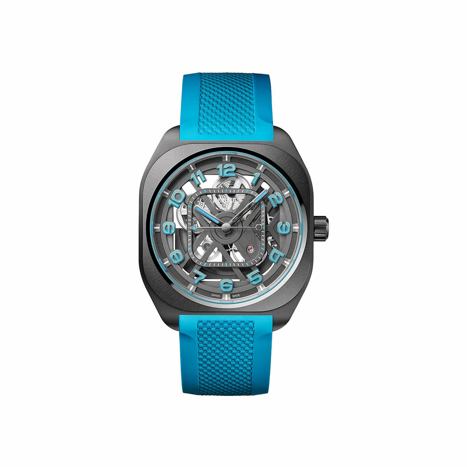 Montre en titane traité DLC noir, lunette en céramique satinée soleil avec chanfreins polis miroir, mouvement de Manufacture Hermès H1978 S, cadran ajouré noir avec minuterie décalquée grise, bracelet en caoutchouc bleu Zanzibar