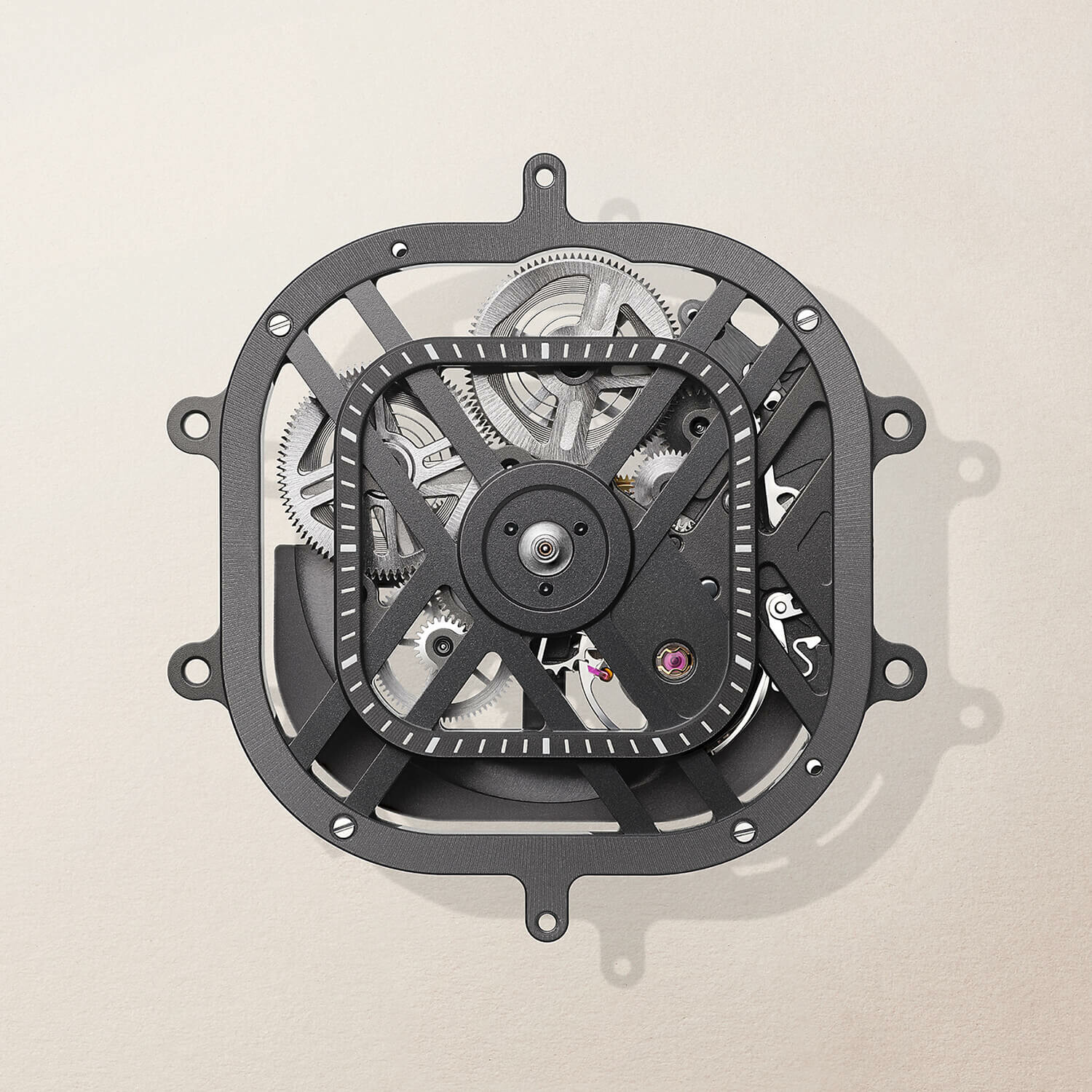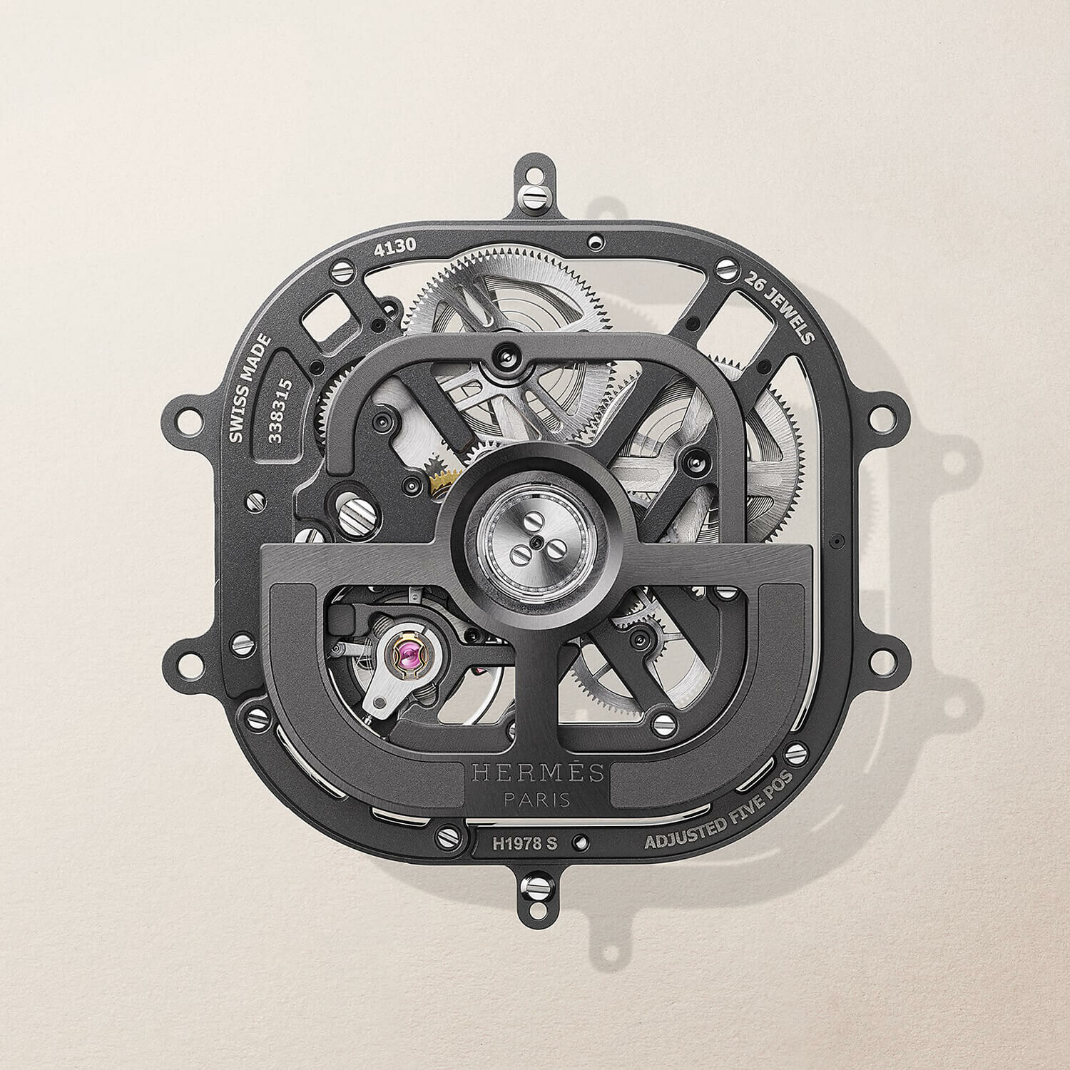 Montre en titane traité DLC noir, lunette en céramique satinée soleil avec chanfreins polis miroir, mouvement de Manufacture Hermès H1978 S, cadran ajouré noir avec minuterie décalquée grise, bracelet en caoutchouc noir